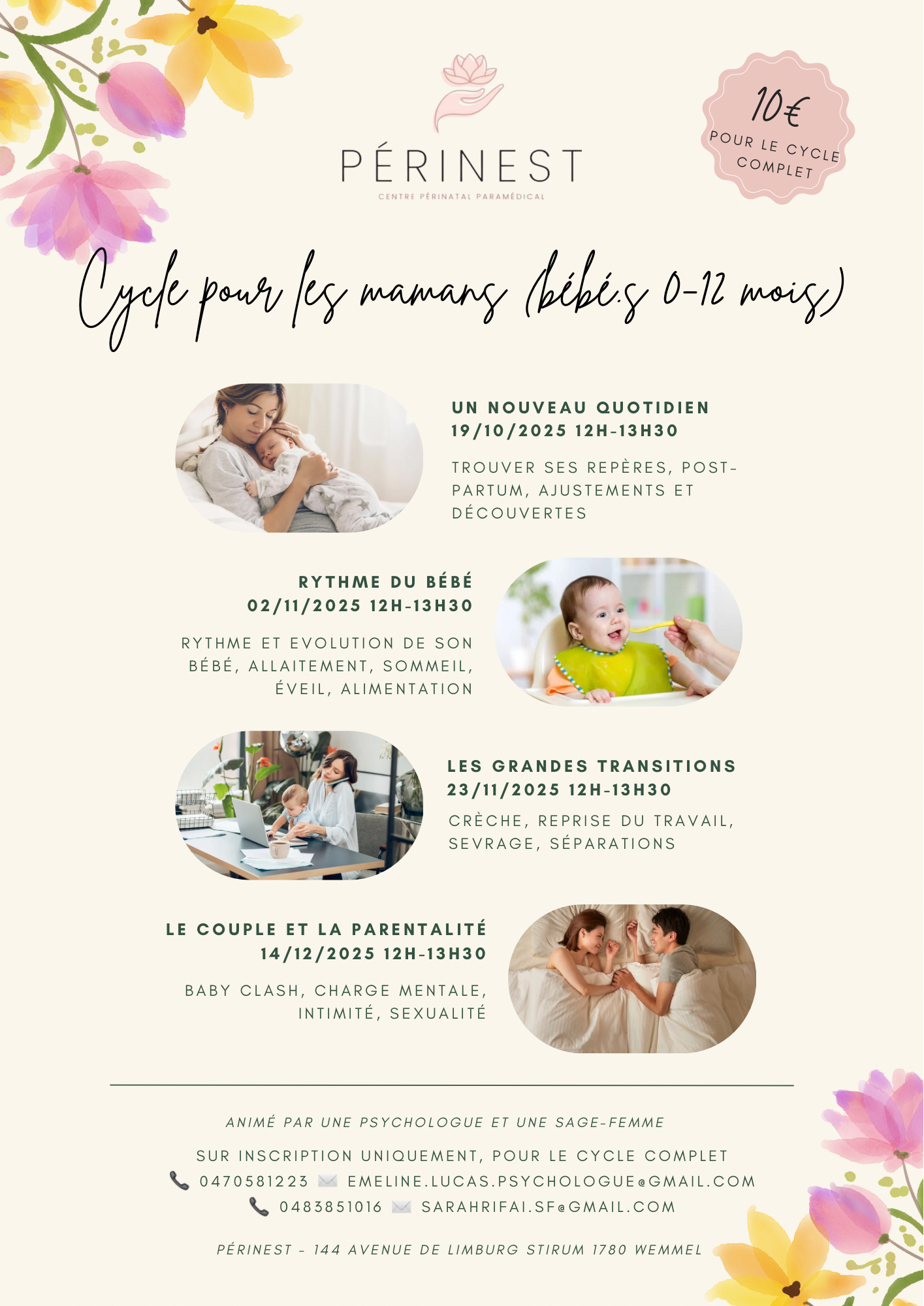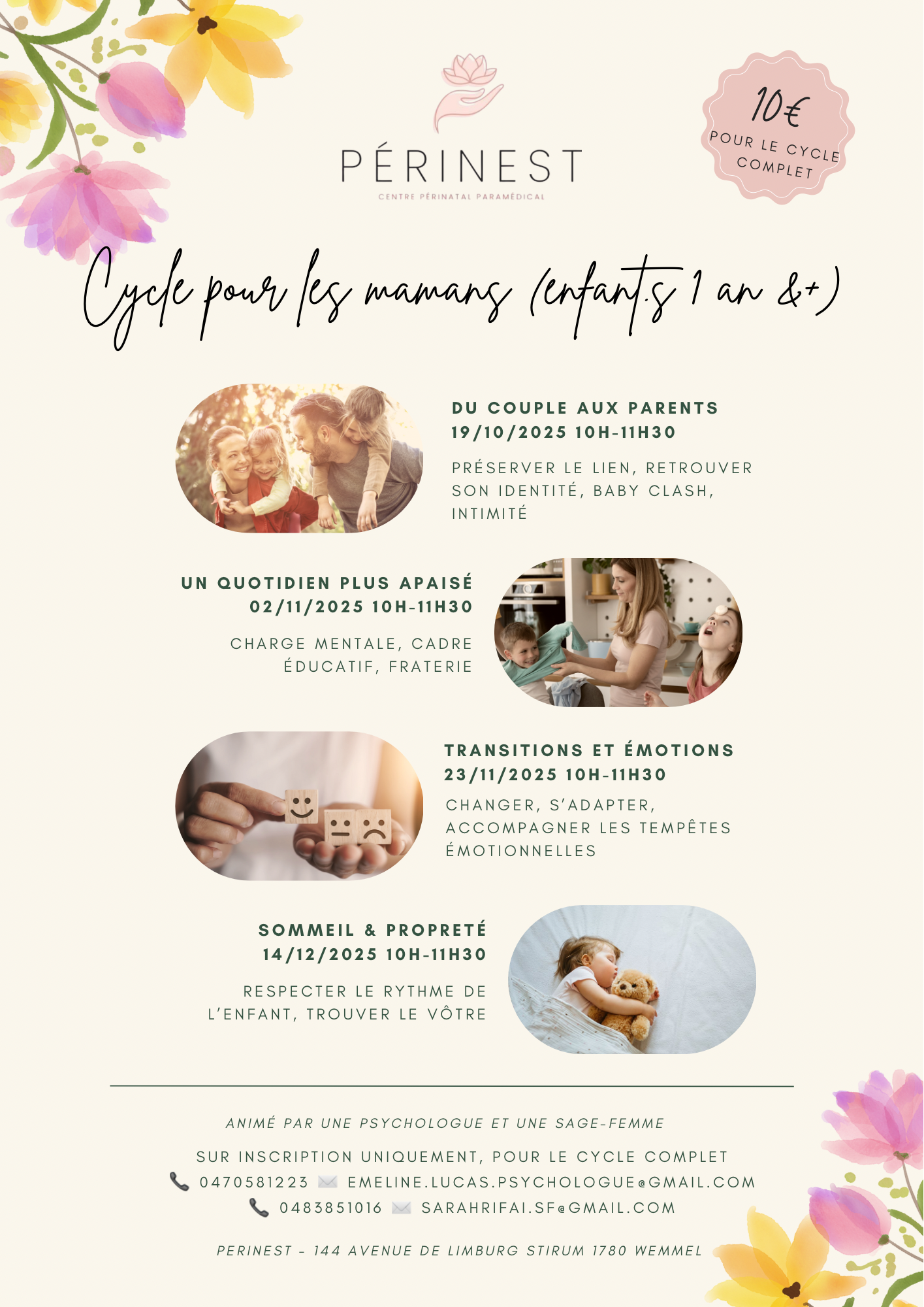 Depuis la naissance de ma fille, j'ai aussi été sensibilisée aux défis de la parentalité. Les études montrent, malheureusement, que le suicide est la première cause de mortalité chez les mères d'enfants en bas-âge, notamment la première année. C'est pourquoi, je veux pouvoir apporter un soutien aux jeunes parents et le cabinet Périnest me semble être le lieu idéal pour créer ce village dont tout parent a besoin. En parallèle des thérapies individuelles, j'anime donc des cercles de mamans avec Sarah Rifaï, sage-femme et sexologue, spécialiste du post-partum.
